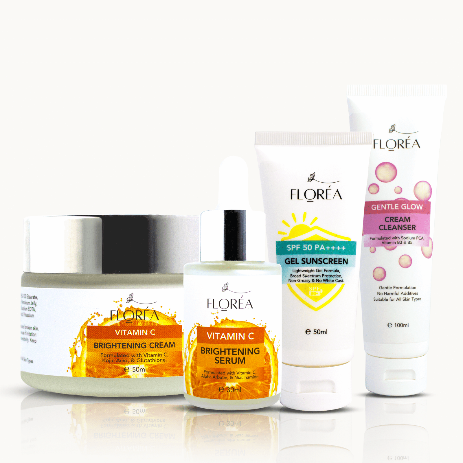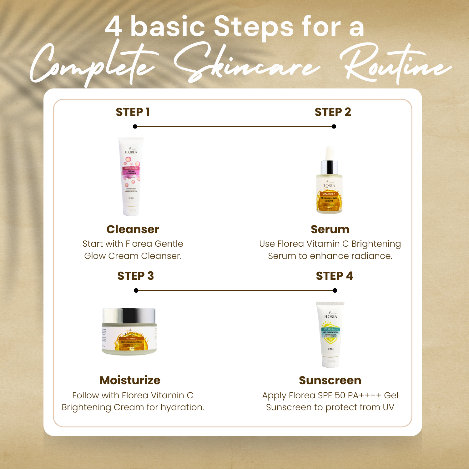Florea Gentle Glow Cream Cleanser, SPF 50 PA++++ Gel Sunscreen, Vitamin C Serum & Cream. A complete skincare regimen in one bundle! Cleanse, brighten, hydrate, and protect your skin for a flawless glow.