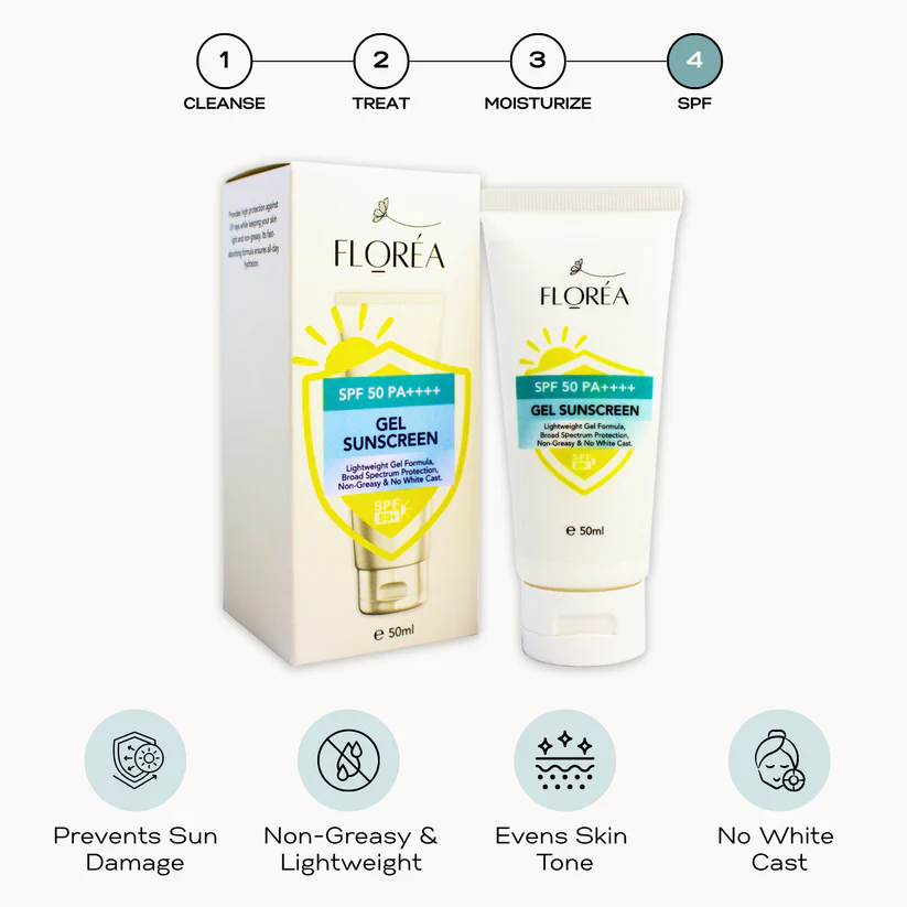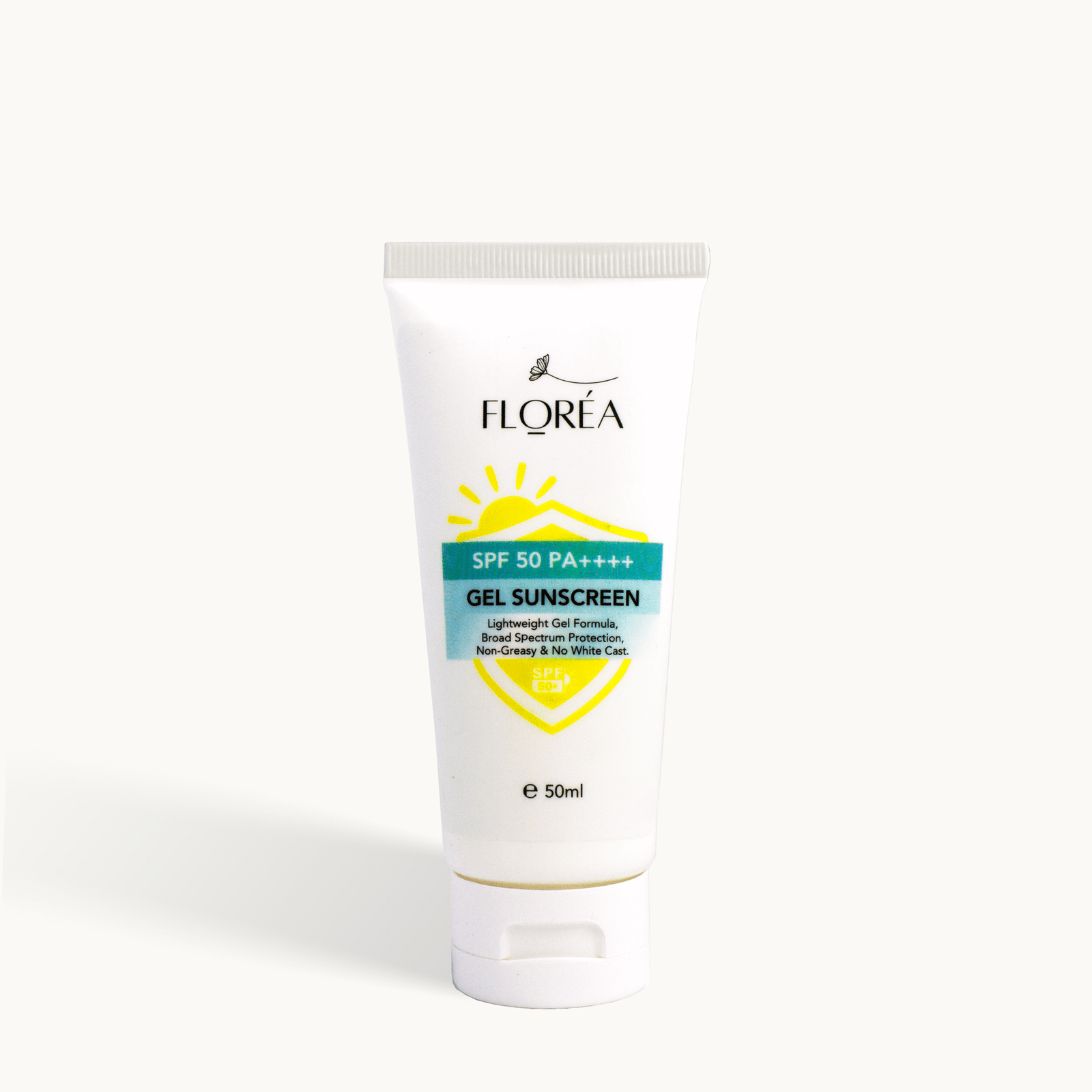 Florea SPF 50 PA++++ Gel Sunscreen provides superior broad-spectrum protection against harmful UVA and UVB rays. Its lightweight, non-greasy gel formula absorbs quickly without leaving a white cast, making it perfect for all skin types. Enriched with hydrating and soothing ingredients, it keeps your skin moisturized and refreshed while protecting it from sun damage. Suitable for daily use, this sunscreen ensures your skin stays safe, radiant, and healthy.
