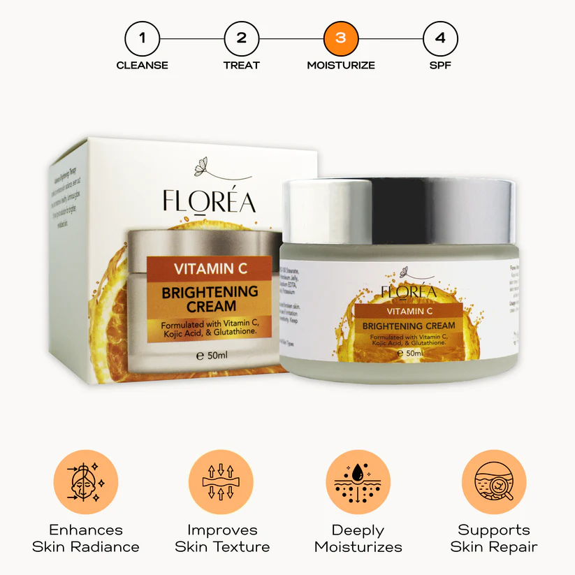 Florea Vitamin C Cream is a powerful blend of Vitamin C, Kojic Acid, and Glutathione, designed to brighten and even out your skin tone. It reduces dark spots and hyperpigmentation while improving skin texture and protecting against environmental damage. Suitable for all skin types, this cream leaves your skin glowing and refreshed.
