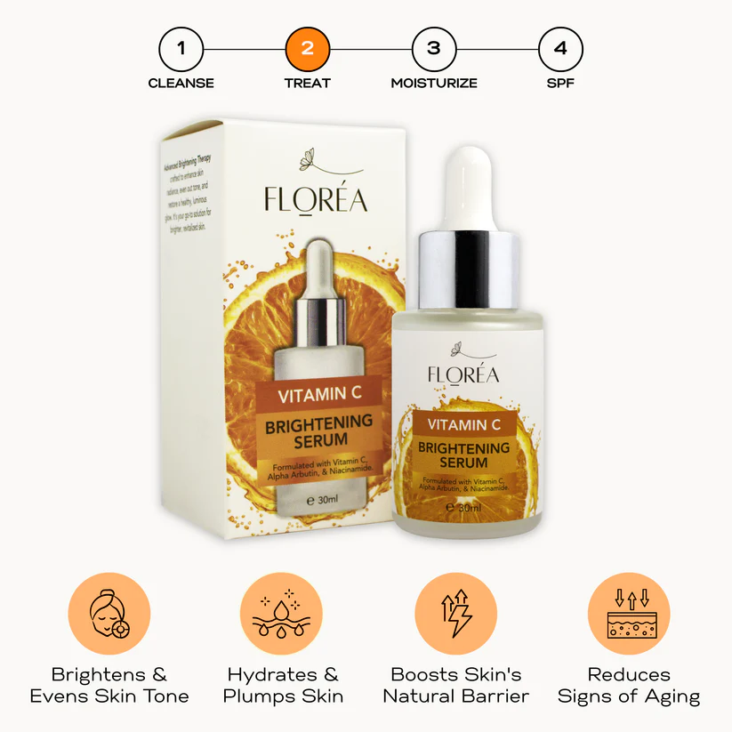 Florea Vitamin C Serum is formulated with Vitamin C, Alpha Arbutin, Niacinamide, and Hyaluronic Acid to target dark spots, smooth skin texture, and enhance hydration. This lightweight, fast-absorbing serum promotes a radiant, even-toned complexion, leaving your skin soft, glowing, and refreshed. Perfect for daily use to achieve visibly brighter skin.